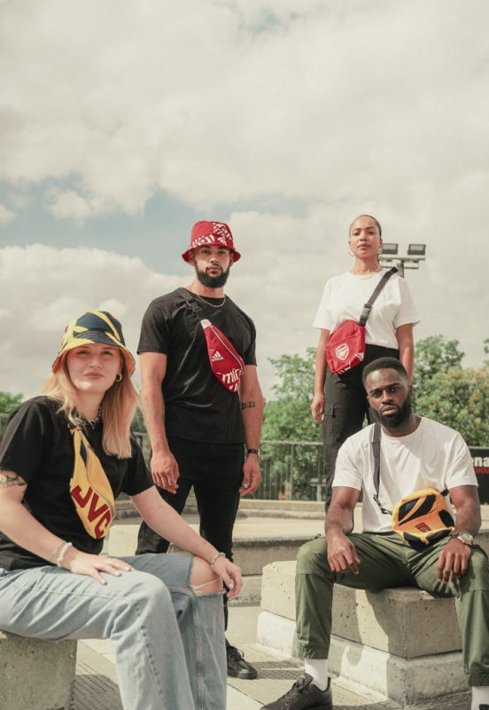 A coleção apresenta chapéus, bumbags e crossbodies reciclados, feitos de forma sustentável a partir de camisas do Arsenal não vendidas de temporadas anteriores.