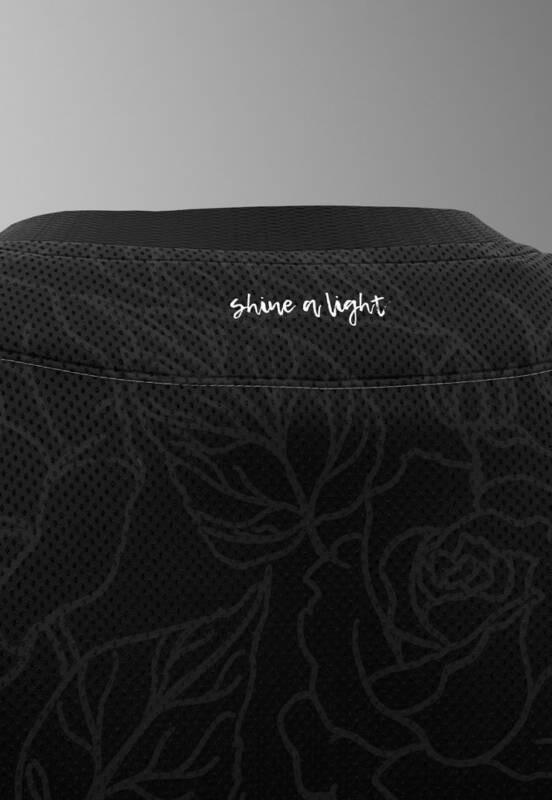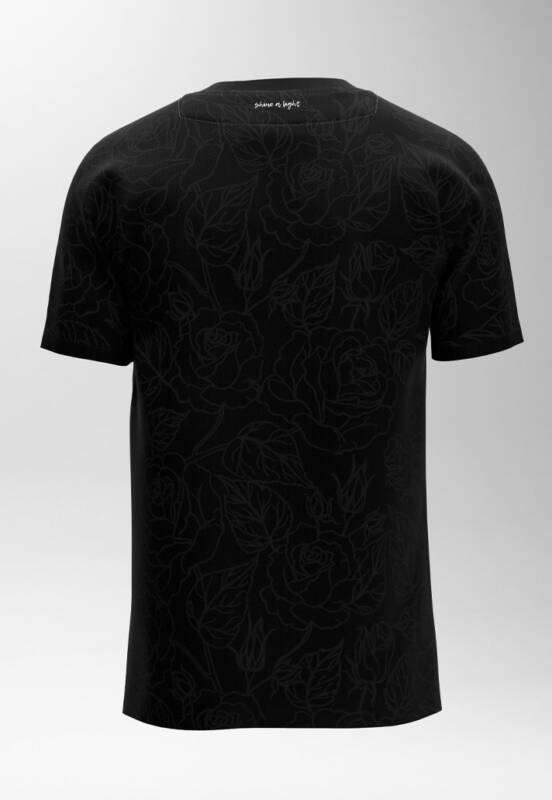 A camisa em si apresenta um padrão de rosa lindamente sublimado na frente e nas costas, bem como uma crista de rosa iridescente que só reflete e floresce verdadeiramente quando uma luz brilha sobre ela; detalhes sutis escondidos na escuridão.