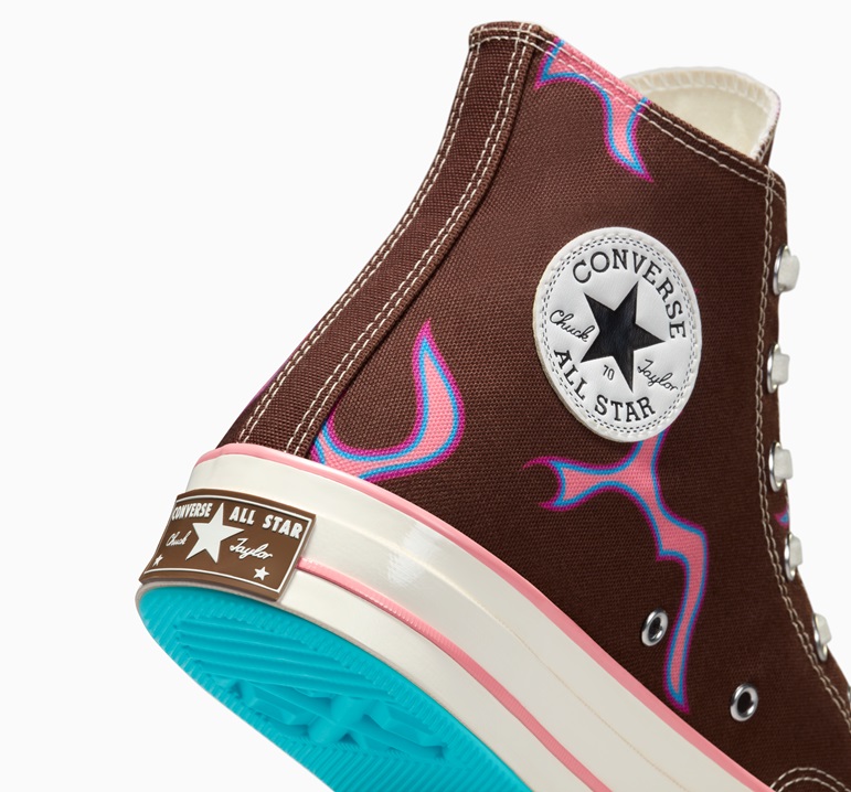 A famosa personalização teve seu debut em 2019, como uma homenagem ao álbum “Cherry Bomb” lançado por Tyler em 2015. Essa estética única foi revisitada em 2021, desta vez em uma envolvente combinação de tons de amarelo. Agora, o novo Converse x GOLF WANG Chuck 70 Flames recria o contraste distintivo entre o azul, uma constante nos modelos dessa colaboração, e um fundo marrom, destacando as chamas vibrantes em tons de rosa.