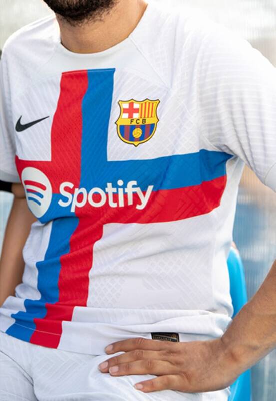 Com um design simplista que mantém as cores tradicionais do clube no coração, a Nike lança a terceira camisa do Barcelona 22/23, que traz uma base cinza clara sobreposta por um gráfico cruzado composto pela clássica combinação blaugrana de azul e vermelho.