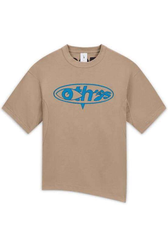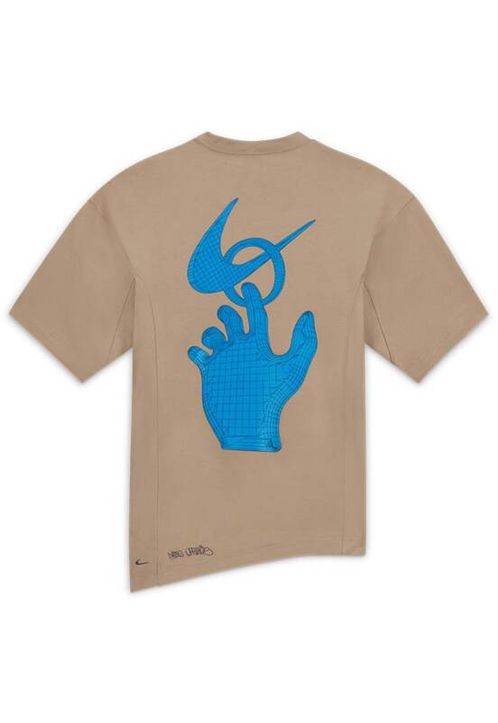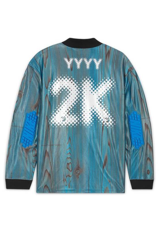 A peça principal desta mini cápsula é a camisa de goleiro, que vem com um padrão único de veios de madeira sublimada, combinados e apresentados em tons de azul para fazer referência ao logo “Swimming Man” que aparece no peito. Cotoveleiras aparecem nas mangas e soletram “Nike” para um belo floreio.