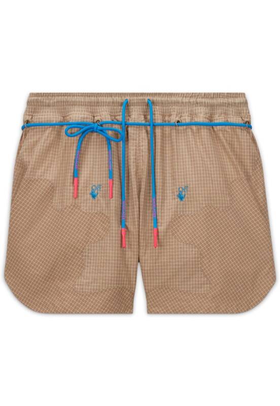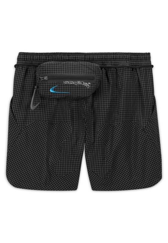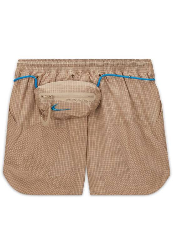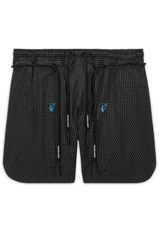 A coleção apresenta dois pares de shorts trançados projetados com um tecido ripstop leve e resistente à água, com cadarços externos e bolsos utilitários para armazenamento. Completando a coleção, há duas camisetas assimétricas na parte inferior e apresentam gráficos Off-White e Nike em negrito na frente e nas costas.