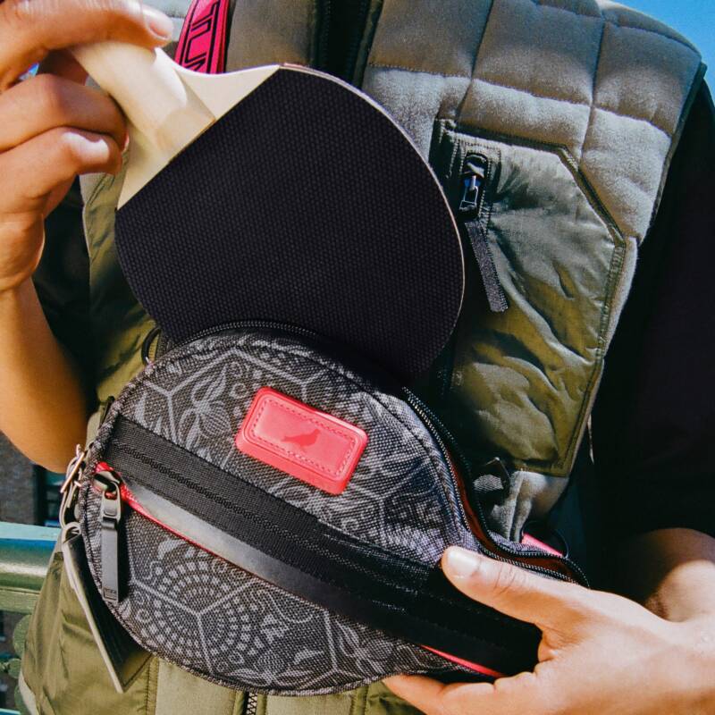 Uma peça mais lúdica, a subversiva TUMI | STAPLE Ping Pong Crossbody ($ 250 USD) apresenta uma estampa que ecoa os azulejos de Barcelona, ​​​​com tamanho perfeito para manter o essencial por perto.
