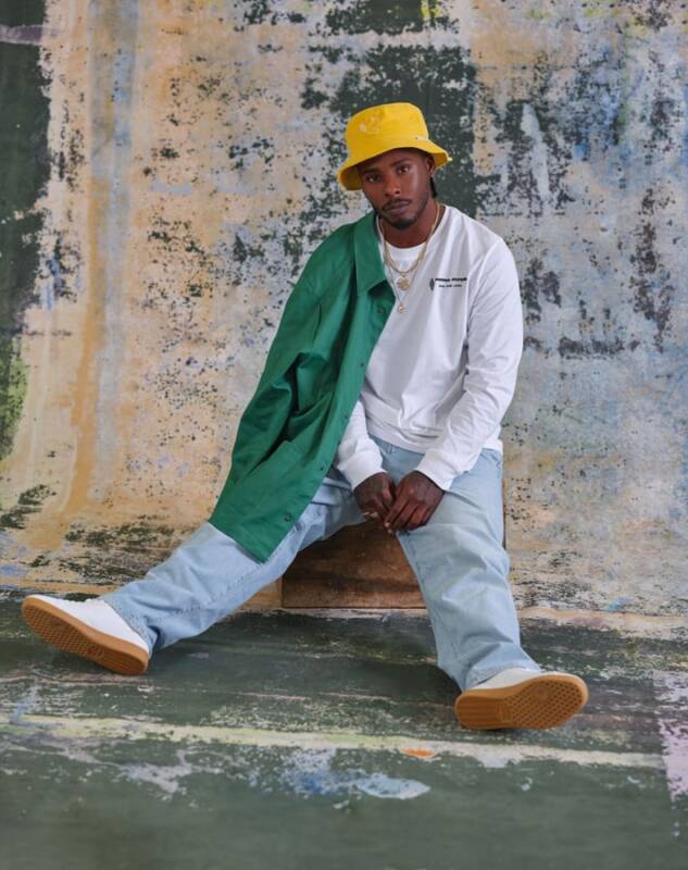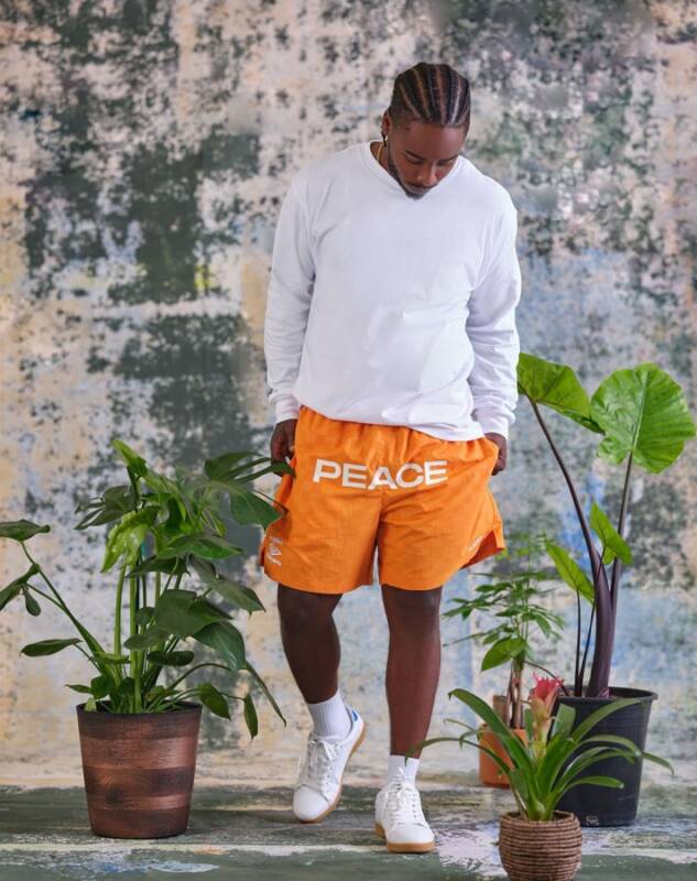 A coleção apresenta jaquetas, drill tops, camisetas, shorts, bucket hats e muito mais, todos apresentados em blocos de cores primárias com branding conjunto e mensagens de paz por toda parte.