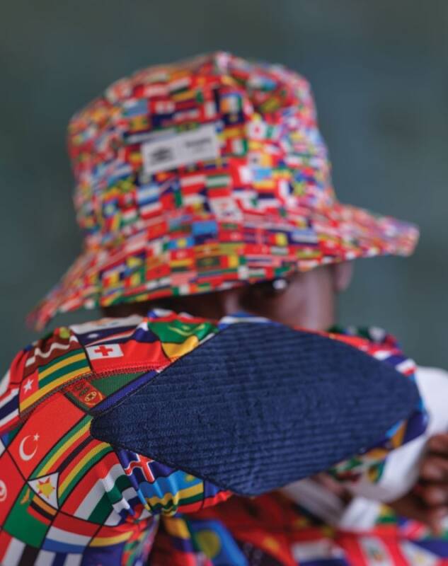 A peça de destaque da coleção é certamente a camisa da Paz Mundial e o bucket hats que a acompanha, cada um apresentando todas as 192 bandeiras nacionais. Bastante olhar.